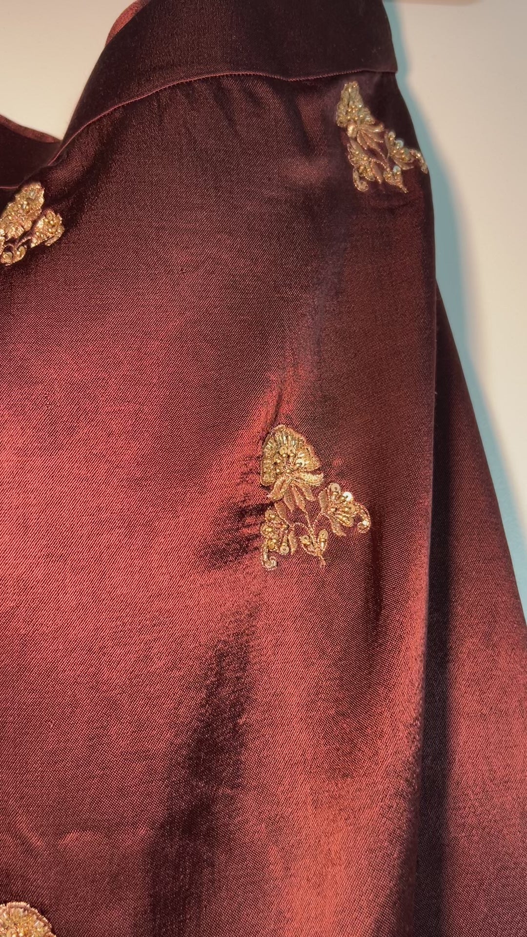 Model is 5'4" wearing a Burnt Orange Skirt with Gold embroidery in size M-Short
