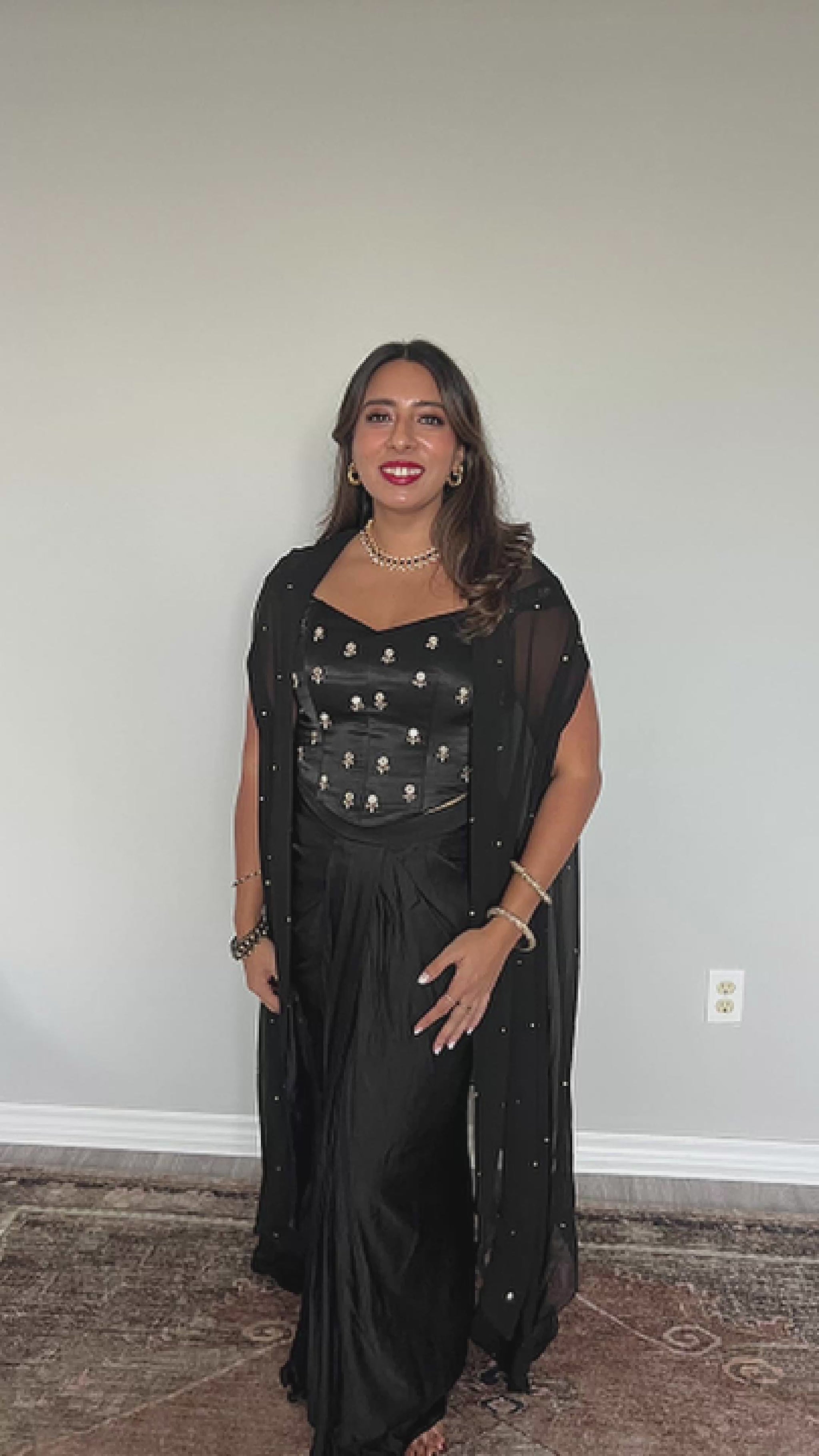 The Usha Cape Dupatta is a sheer georgette layer designed like a jacket, with armholes for effortless wear. Hand-embellished with sequins all over, it adds instant sparkle and coverage while keeping your hands free. Pair it with any Indo-Western outfit to give a modern finish.